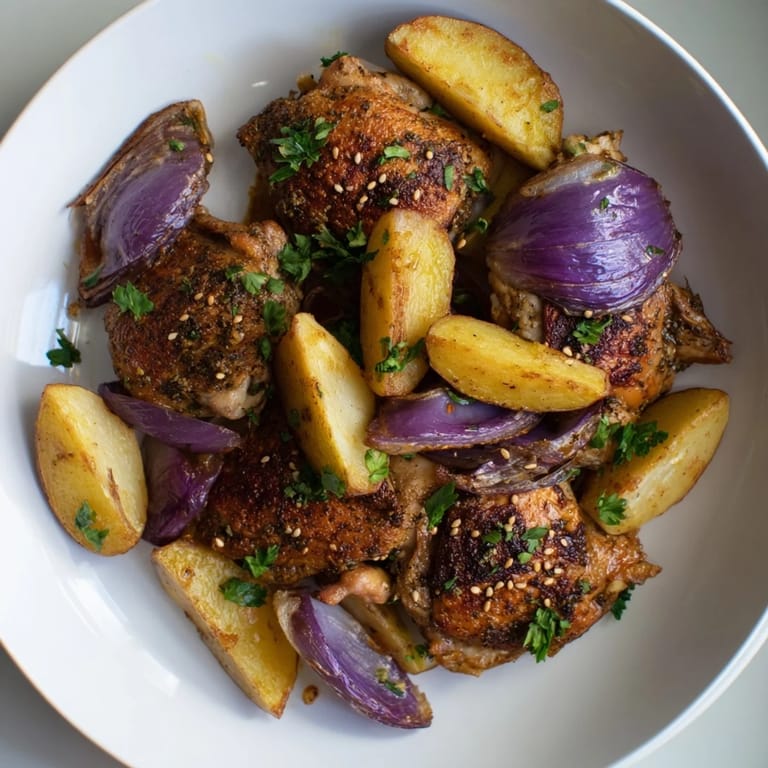 Pin A vibrant, aromatic dish featuring crispy chicken thighs and golden potatoes, tossed in fragrant zaatar and roasted to perfection a simple weeknight meal bursting with Middle Eastern flavors.