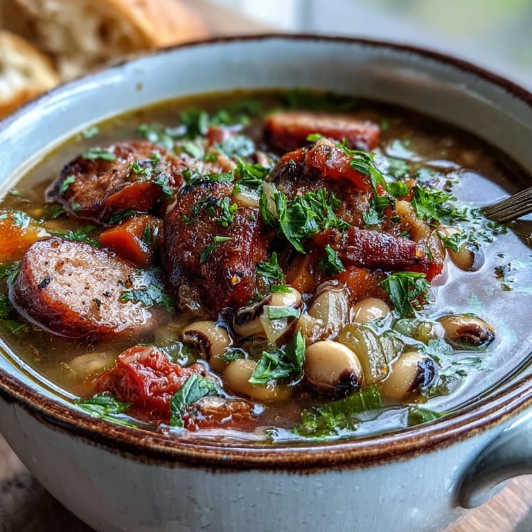The beauty of this soup is how forgiving it is. I've made it without the sausage on days when I wanted something lighter, and it still sings when you add a pinch of smoked paprika to deepen the flavor. Sometimes I'll throw in fresh spinach or kale at the very end, letting it wilt right into the warm broth, which adds color and an earthiness that pairs beautifully with the peas. On nights when I want something heartier, I've mashed about a quarter of the black-eyed peas before serving, which gives the soup a thicker, more luxurious body.