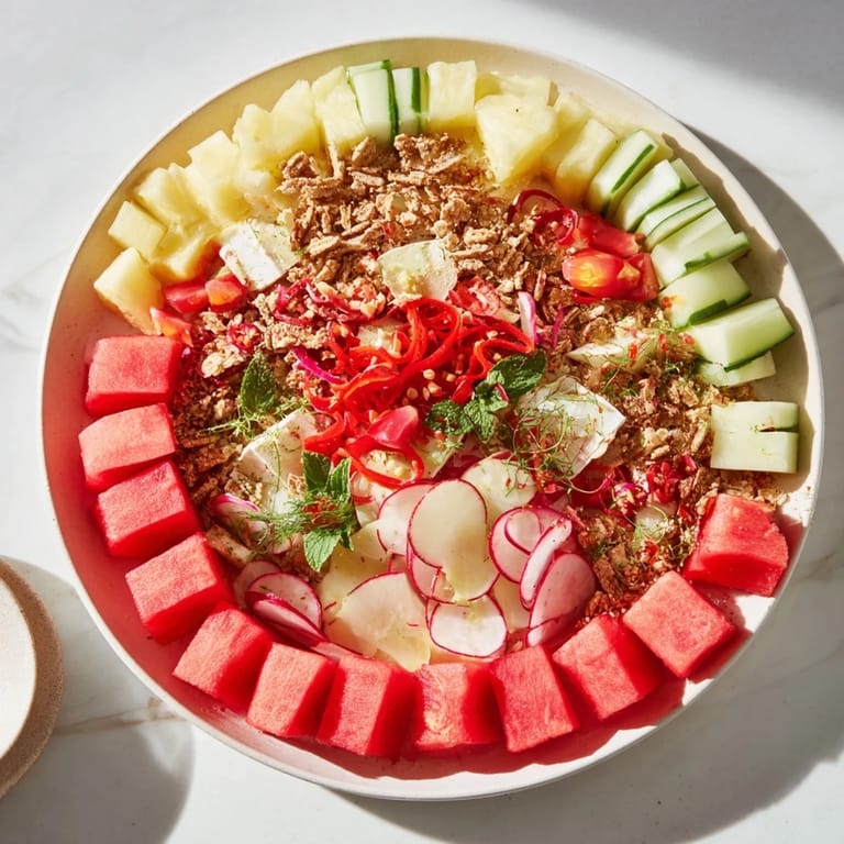 Once you understand the framework of this dish, you realize how infinitely customizable it becomes. I've made it with mango and strawberries in the sweet ring when pineapple wasn't in season, and it was just as stunning. The savory ring can adapt to whatever you have—I've added grilled chicken, shrimp, or even kept it purely vegetarian with crispy chickpeas as the protein. The only rule is to respect the balance: sweet, savory, and spicy, arranged in harmony. That balance is what makes this recipe work so perfectly, no matter what ingredients you choose.
