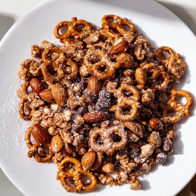 Mini pretzel twists, rice cereal squares, roasted almonds, and honey-roasted peanuts provide a satisfying crunch.