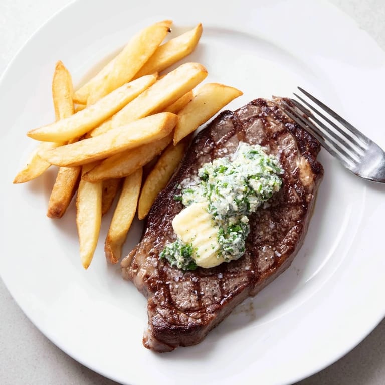 Pin A classic steakhouse favorite featuring perfectly seared steak topped with rich garlic-herb butter, served with crisp golden fries.