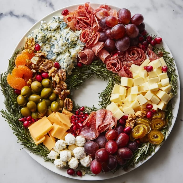 Pin A festive, visually stunning cheese platter arranged in the shape of a holiday wreath featuring a variety of cheeses, cured meats, fresh fruits, and herbs perfect for entertaining.