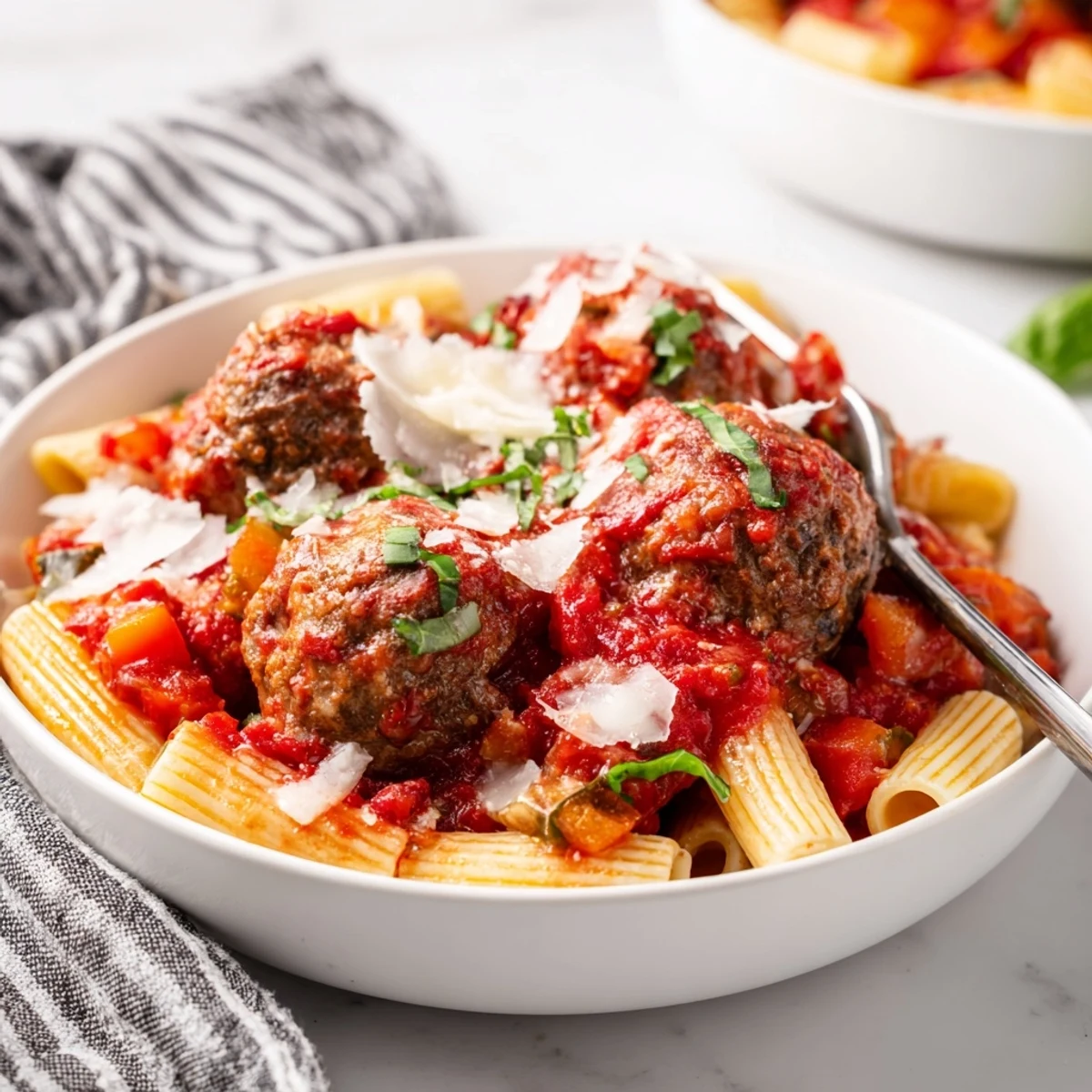 One-pan Italian dish with meatballs, rich tomato sauce, pasta, and melted cheese for a hearty dinner.