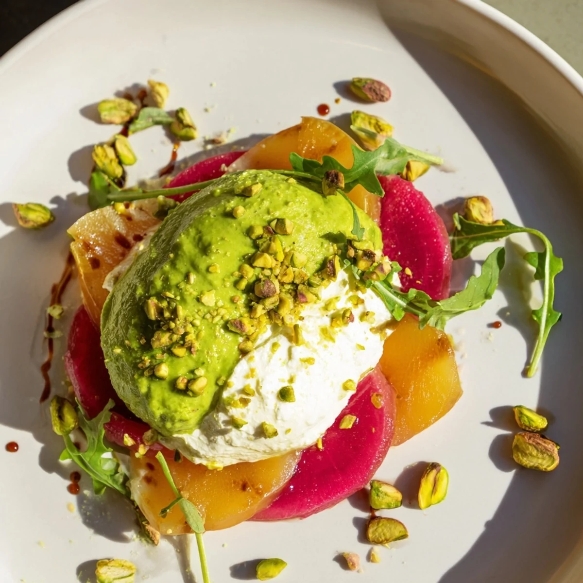 - Garnish: Handful of baby arugula leaves, edible flowers (optional), extra chopped pistachios