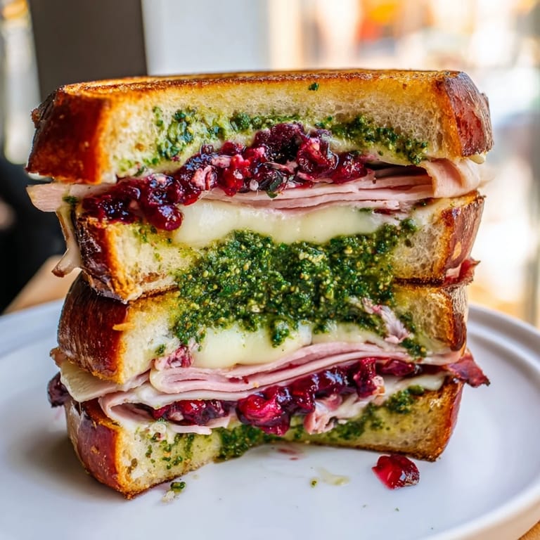 Pin A gourmet twist on the classic grilled cheese: juicy turkey, tangy cranberry sauce, and aromatic pesto melded with melted cheese between golden buttery bread Perfect for using holiday leftovers or creating a hearty flavorful lunch
