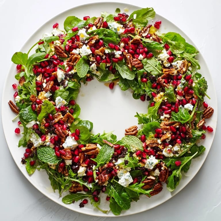 Pin A festive, vibrant salad featuring juicy pomegranate seeds, creamy feta, and fresh herbs, artfully arranged in a wreath shape perfect for holiday celebrations.